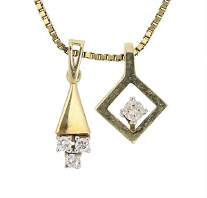 lot: 2 pendants yellow gold 585/000, 1 pendant, 1 brilliant c. 0.13 ct w-si/p, height = 16.0 mm, 1 pendant, 3 brilliants c. 0.15 ct w-si, height = 21.0 mm, 1 gold filled chain lenght = 38.5 cm