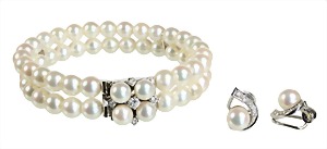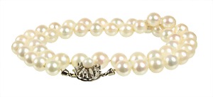 Lot: Perlen-Armband (2-reihig) und Ohrclips, WG 585/000, Armband: Schließe mit 5 Brillanten besetzt ca. 0,26 ct tw/w-vsi, Kastenschloss mit Sicherung, Akoja-Perlen D = ca. 6,3-6,8 mm, Länge ca. 18,5 cm; Ohrclips mit 10 Stck. 8/8-kant Diamanten weiß, H = 14,2 mm, alle Perlen mit schönem Lüster !