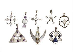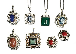 pendant, 1910/'20s, silver, 830/000 S, decorative green chalcedony, all round delicate wire spiral with stylized leaves, between 6 green chalcedonies , height = 64.0 mm, similar works are known by Theodor Fahrner !