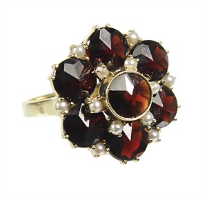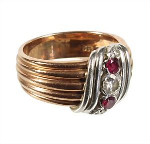 ring "THEODOR FAHRNER" Pforzheim from the 1930/'40s (filigree jewelry), silver 925/00 gilded, signed: TF 925, 2 corals cabochons, markasites, ring width c. 53.5 No shipping outside of the EU !