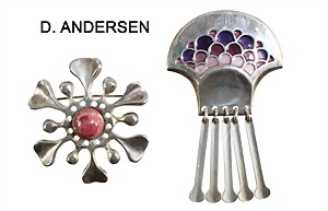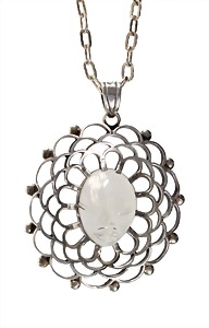 brooch DAVID ANDERSON around 1930, silver 930S gilded, mother of pearl- enamel (with patches with flaws), at necklace a haning triangle, filigree wire elements, hanging balls and drop, height = c. 93.8 mm