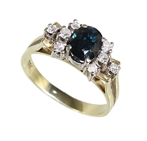 Ring, GG 585/000, 1 Saphir ca. 0,20 ct (facettiert), 6 Brillanten ca. 0,07 ct weiß, RW ca. 52