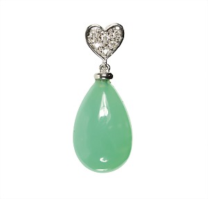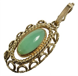 Anhänger, 1910/20er Jahre, Silber, 830/000 S, dekorativer grüner Calcedon, umlaufend zarte Drahtschnecken mit stilisierten Blättern, dazwischen 6 grüne Calcedone, H = 64,0 mm, ähnliche Arbeiten kennt man von Theodor Fahrner !