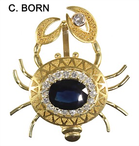 brooch, vine leaves with grape, "WILHELM MÜLLER" Pforzheim 1910/'20s, silver 800/00, signed: world championship 800, (unsigned brooch by "THEODOR FAHRNER", mentioned in the literature!), 2 lapis lazuli cabochon height = c. 41.6 mm, width = 36.5 mm, plastic nice formed leaves ! literature: Arnoldsche "THEODOR FAHRNER SCHMUCK" page 145-147