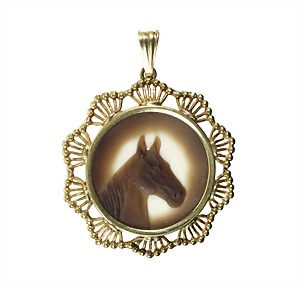 Anhänger um 1860/70, GG 9 ct (375/000), Scherenschnittportrait, Malerei auf Perlmutter, zarter floraler Kranz (fast nicht mehr sichtbar), H = 38,8 mm