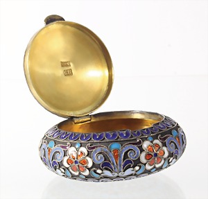 Dose mit Scharnierdeckel, Russische Cloisonné, Moskau um 1900, 84 Zolotniki (Silber), Meisterpunze: G K, innen vergoldet, floral ornamental emailliert, vorwiegend in blauen Farbtönen, orange und weiße Akzente, schönes Farbenspiel, D = 5,2 cm, sehr guter Zustand !