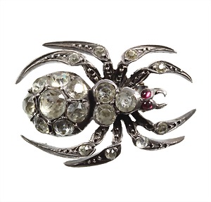 brooch spider, second half 19th century, silver, set with colorless stones, white (worn), 2 red cabochon eyes, c. 31.7 x 22.6 mm