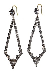 EISEN-Ohrhänger, wohl England Ende 19.Jhd. (Victorian), aufwändig eingenietete Eisenköpfe (an der Oberfläche facettiert), Goldbügel GG 750/000, signiert, H = 87,2 mm (es fehlen 3 Nieten)!