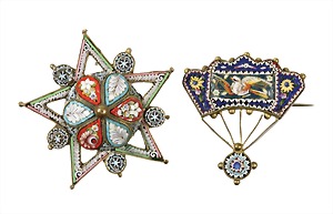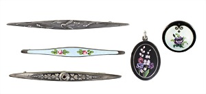 lot: art nouveau around 1900, silver 800/000 and metal (silver-plated, 1 pendant, picture of the Virgin Mary, diameter = 21.8 mm, 3 brooches: 1 head, SCHILLER, diameter = 20.0 mm, 1 female bust, floral framed, relieflike worked, c. 49.5 x 35.6 mm, (brooch element is more recent), 1 brooch, blue translucent enamel surrounded by fine-stemmed leaves, c. 29.0 x 32.7 mm
