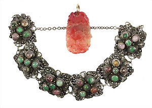 Lot: Armband und Anhänger, Asien, China ?, Armband, Silber 800/000, signiert: SILVER UI.M 800, farbige Steincabochons, Kastenschloss mit Sicherheitskettchen, L = 18,5 cm, B = 25,5 mm, feine Drahtarbeit; 1 Anhänger GG 333/000, gravierte Jade, H = ca. 43,0 mm