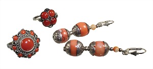 Lot Korallenschmuck: 2 Ringe, ART-DECO 1930/40er Jahre, Silber 835/000, Korallen und Markasite, RW ca. 54 und 55,5; 1 Paar Ohrhänger, H = 52,3 mm Für diesen Artikel ist ein Versand in nicht EU-Länder leider nicht möglich !