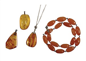 lot: 3 amber pendant and 1 amber necklace, 1 pea chain silver 835/000, lenght = 59.0 cm, pendant height = 49.4 - 59.2 mm, amber necklace, silver 835/000, lenght = 55.5 all total 79.2 g