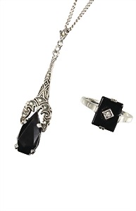 lot: ART-DECO 1920/'30s, 1 ring, white gold 750/000 (18 ct), central old-cut diamond c. 0.02 ct white, onyx plate (with flaked off part at the side ), ring width c. 54, necklace, silver 935/000, pendant with onyx plate and markasites, height = 36.5 mm, chain, silver 925/000, lenght = c. 42.5 cm
