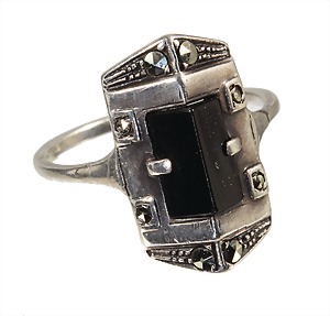 ring, "ART-DECO" 1930s/'40s, silver 925/000, roof-shaped cut onyx, markasites, ring width c. 54.5