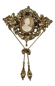 Brosche um 1870/80, GG 585/000, Muschelgemme, reliefiertes gedrücktes Blech, zwei an einer Kette, abgehängte Pampeln, ca. 50,3 x 74,0 mm