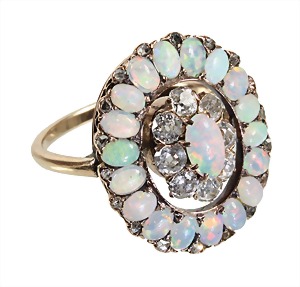ring around 1890/1900, yellow gold 585/000, 1 central opal, 18 additional colorful opals in an oval garland (stones are worn), 8 old-cut diamonds c. 0.6 ct white with inclusions, outside 18 rose cut diamonds (1 stone is missing !), ring width c. 54