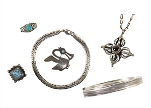 lot: silver 835/000 and 925/000, 1 brooch, stylized bird with small turquoise eye, 2 rings with turquoise-colored stones, 1 Indian bracelet (foxtail) lenght = c. 22.0 cm, 1 bracelet inside c. 62.0 x 55.0 mm, 1 pendant cross, set with grenades on both sides height = c. 48.5 mm, chain lenght = 90.0 cm. total 94.2 g,
