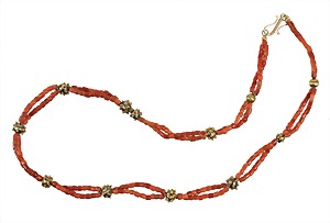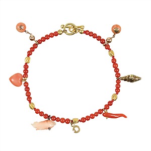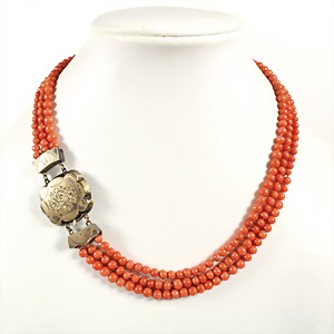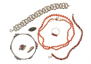 lot: silver jewelry partially with coral, 1 bracelet, all round jeweled with 3 corals, diameter = c. 66.0 mm, 4 rings, ring width c. 53-59, 1 bracelet, lenght = ca.20,5, 1 bracelet, textured pressed sheet metal, width = 15.7 mm, 1 corals necklace, gold filled, yellow gold 333/000 (safety chain), diameter in front = 6.5 mm, lenght = 57.5 cm total 81.1 g unfortunately this item can't be shipped to non-EU countries!