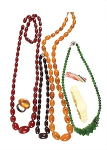 lot: fashion jewelry, ART-DECO 1930/'40s, partially a little bit more recent, bakelite/plastic/stone, among others 1 chain, amber butterscotch colored, olives 8.5 - 18.0 mm, lenght = c. 70.0 cm, 1 ring, ring head diameter = 29.7 mm, ring width c. 59, 1 brooch, signed: LEA STEIN PARIS c. 49.5 x 11.0 mm, 1 ivory bracelet, diameter = c. 50.0 mm , unfortunately this item can't be shipped to non-EU countries!