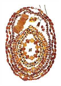 lot amber jewelry (13 pieces): partially amber BUTTERSCOTCH, 7 necklaces, lenght = 42.0 -72.5 cm, 1 pair of studs diameter = 14.0 mm, 1 ring, silver, ring width c. 52, 1 necklace with pendant, silver 925/000, lenght = c. 50.0 cm, 1 brooch and 2 bracelets, all total 296.2 g