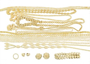 lot: mainly ivory (some ivory) first half of the 20th century, 10 necklaces, partially graduated, 1 chain with pendant (ERBACHER rose), 1 pair of ear clips diameter = 14.0 mm, 1 pair of ear clips (ERBACHER rose) diameter = 25.5 mm, 1 ring, 1 double-strand bracelet, inside: diameter = c. 52.0 mm (pull cord), all total c. 265 g, unfortunately this item can't be shipped to non-EU countries!