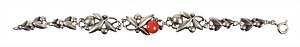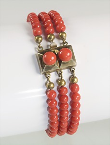 Lot: Silberschmuck teilweise mit Koralle, 1 Armreif, umlaufend mit 3 Korallen besetzt, D = ca. 66,0 mm; 4 Ringe, RW ca. 53-59; 1 Armband, L = ca.20,5; 1 Armband, reliefiertes gedrücktes Blech, B = 15,7 mm; 1 Korallen Kette, Double, GG 333/000 (Sicherheitskettchen), vorne D = 6,5 mm, L = 57,5 cm total 81,1 g Für diesen Artikel ist ein Versand in nicht EU-Länder leider nicht möglich !