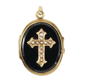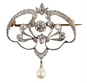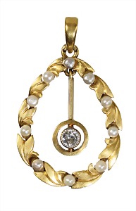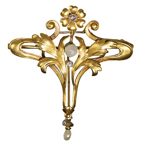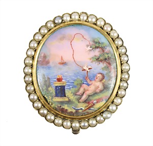 brooch around 1920, yellow gold 585/000, fine intaglio painting behind rock crystal, 3 pieces natural pearls, 1 blue stone (sapphire ?), height = 36 mm, comparable painting in the Schmuckmuseum Idar-Oberstein