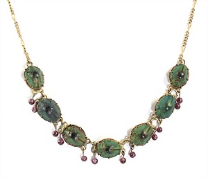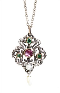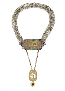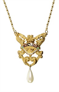 necklace first half of the 19th century, gold filled fire-gilded (pressed sheet metal), enameled, hanging pearl (probably more recent), height in front = 53,8, lenght = 47.5 cm