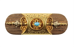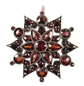 Brosche, BIEDERMEIER 1.Hälfte 19.Jhd., golddoubliert, zentral 5 Almandine (facett.), weiß emailliertes Mäandermuster, von hinten als Medaillon gearbeitet (mit orig. Haarlocke), ca. 37,8 x 31,8 mm