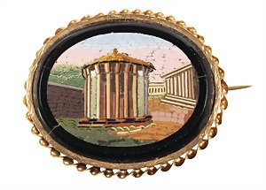 Brosche um 1920, GG 585/000, feine Intagliomalerei hinter Bergkristall, 3 St. Naturperlen, 1 bl. Stein (Saphir ?), H = 36 mm, vergleichbare Malerei im Schmuckmuseum Idar-Oberstein