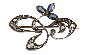 lot: art nouveau around 1900, silver, partially gilded, 1 scarf/cloth holder, central blossom, wit clip in the back to close it, height = c. 33.3 mm, 1 brooch, female bust, gold colored framed, diameter = c. 27.5 mm, 1 brooch, silver-plated, two stylized peacocks, in the middle a shimmering glass peacock eye c. 33.7 x 19.5 mm, all in nice condition