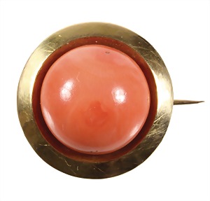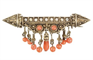 brooch 1870/'90s, gilded silver , 1/2 pearls, hanging coral balls, knurled soldered with wire, lenght = c. 55.0 mm, unfortunately this item can't be shipped to non-EU countries!