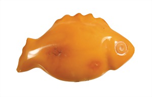 Brosche "FISCH", um 1940/50, Bernstein "BUTTERSCOTCH", vollplastisch ausgearbeitet, ca. 48,5 x 27,9 mm, total 8,4 g.