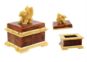 Schatulle, BERNSTEIN BUTTERSCOTCH, rechteckige Schatulle auf abgesteppten Füßen und Deckel, oben thront ein Chinesisches Fabelwesen (Drache mit einem Vogelkopf ?), vollplastisch ausgearbeitet, 1 Flügel rep., 2 winzige Chips, Truhe ca. 81,5 x 70,7 mm, Höhe ca. 93,0 mm, total 149,5 g