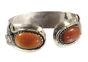 Armreif 1930/40er Jahre, Silber 800/000, sig. H Hahn (Symbol, Juwelier HAHN Stade), BERNSTEIN BUTTERSCOTCH ca. 23,0 x 14,0 mm (2 Stck.), seitlich Blätter mit Markasiten ausgefasst, innen ca. 60,0 x 47,0 mm, alte Reparaturstelle, total 36,0 g