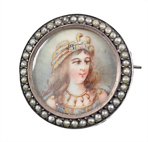 Brosche um 1850, Silber, sig., Miniaturmalerei hinter Glas, Portrait einer Dame, goldstaffiert, im umlaufendem Kranz sind 42 Natur 1/2 Perlen eingefasst. Der unter dem Perlrand sitzende Gader ist fein durchbrochen, D = 23,0 mm