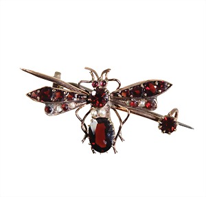 Brosche, Ende 19.Jhd., INSEKT, GG 333/000, Granate, 6 Stck. 1/2 Perlen, ca. 39,5 x 21,0 mm, schöner Zustand !