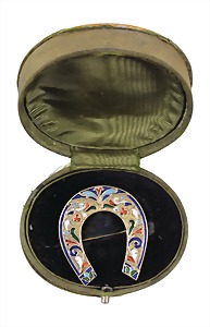 Brosche, HUFEISEN, traditionelle Russische Cloisonné, Moskau um 1900, 84 Zolotnik (Silber vergoldet), sig. Moskau 1899, ornamental emailliert, vorwiegend in blauen Farbtönen, mit orange und weißen Akzenten, ca. 35,5 x 39,0 mm (ca. 4,5 mm stark), schöner Zustand, mit zeitgemäßer Schatulle