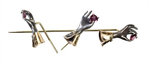 Nadel um 1870/80, HAND, Silber 13 Lot, sig. Pferdekopf (Symbol), facettierter Almandin zwischen 2 Fingern, fein gravierte Manschette, L = 81,0 mm, plastisch fein ausgearbeitet !