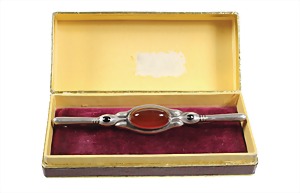 brooch, art nouveau around 1900/10, silver 935/000, signed with makers mark, central cornelian, black enamel at the side , soft organic shaped, lenght = 85.0 mm, contemporary casket