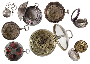 silver pocket watch around 1740/60 by the London watch maker JAMES GRANTHAM, signed: James Grantham London (on the verge mechanism). 4-fold case, 1/4- repetition, unfortunately the year of production can't be established, because the usual London hallmarks are missing, the manufacturer itself is listed at Baille (a photocopy is add), a golden pocket watch can be found in the Fritz-William-Museum (3-fold case ) in Cambridge, a clock with porcelain case in the Guidhall-Museum (London) and a third in the Liverpool-Museum, first case diameter = 40.0 mm, with floral motifs engraved, linear opening at the side, good preserved, second case diameter = c. 47.5 mm, scene with 4 persons, strongly worn, a soldier with gun and bicorne hat, a lady looking down from the balcony, third case, diameter = c. 58.0 mm, decorative and complex designed, the nice painted brown black tortoise shell is decorated with many silver nails and good preserved, the fourth case, diameter = c. 69.0 mm, all round with geometrical design embossed and engraved, good condition, the three cover-cases are inside lined with velvet, the clock mechanism with verge escapement, drum, chain and fusse for compensation of the tension spring force, and a piston that is nice pierced worked , is in working condition the 1/4 repetition is also good working, the clockface with Roman hours numbers and Arabic minutes seems to be retouched , the dark insert is partially lost, the hands that are typical of the time are faultlessly preserved, the pocket watch is all in all good preserved and the third case is in exceptional quality, an unusual object ! complex worked silver chain, lenght = 41.5 cm expertise by A. Abeler publicly appointed and sworn expert Wuppertal from January 1990, description in excerpts ! Unfortunately this item can't be shipped to non-EU countries!