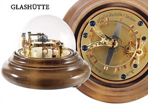 display model a club tooth-lever escapement N° 28/30, built in Glashütte Sachsen, brass, partly gilded, partially engraved, blued screws, wooden case on 3 turned feet diameter = 20.0 cm, height = 13.5 cm, glass dome, very good condition ! and is running and running…. !