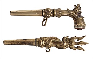 a pair unusual fob watches keys, from the middle of the 19th century, 1 gun, in the handle an agate, at the top fine worked animal head, lenght = 51.0 mm, 1 key NEPTUN with ratch, a fish windes around a trident, height = 57.0 mm