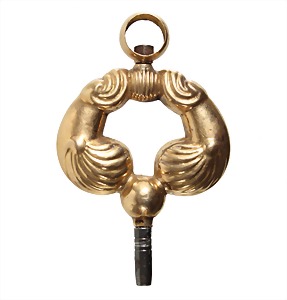 Spindel-Taschenuhrenschlüssel um 1780/1800, GG 585/000 (feuervergoldet), beidseitig fein reliefierte Oberfläche, vollplastisch ausgearbeitet, Aufhängung drehbar, ca. 30,0 x 47,0 mm, schöner Zustand !