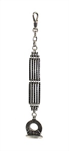 Chatteleine um 1800, Deutsch ? Eisen, Chattellaine zum Einhängen in einen Gürtel/Hosenbund, 3-fach u. 4-fach abgehängte Ketten, die beiden äußeren mit Quasten aus Eisenkugeln, die beiden mittleren mit Karabiner, 1 Spindeltaschenuhrenschlüssel (Ende ausgebrochen), H = 15,7 cm, schöner Zustand !