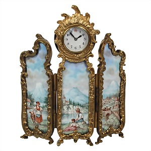 Hübsches Tischührchen, in Form eines Triptychons um 1870/80, Bronze-doré-Gehäuse im Stil des Rokokos, eingearbeitetes Taschenuhrwerk, Emaille-Ziffernbl., arab. Index. Alpenländliche Szene (polychrome Emaillemalerei), Bäuerinnen am Wasser, vor den Bergen eine Kirche, beide Flügel sind mittels eines Scharnier drehbar mit dem Mittelteil verbunden, ca. 95,6 x 110,2 mm, schöner Zustand !
