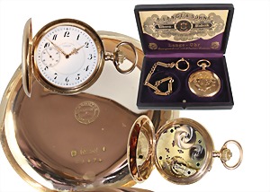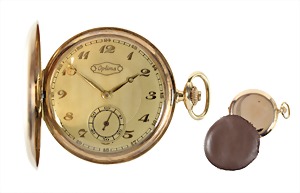 golden men's fob watch, from the clock factory A. Lange & SÖHNE. certificate: based on the present archive records the clock is confirmed as original Glashütter precision product , Glashütte, on Oct 26th 2004 marking: golden men's fob watch Kal.45, brand ALS manufacturer : A. Lang & Söhne, Glashütte mechanism-No.: 25474 case-No.: 25474 buyer: Fa. Dürrstein & Co., Dresden (in the annexure a copy from archive register with buyer confirmation !) day of the sale: Sep 30th 1886 price: 306,- M 20 linig (movement diameter 45 mm), yellow gold case, opened, yellow gold 750/000, case shape BASSINE flat glass, brand ALS, stones set in gold settings , diamond coping stone, second case in spring-cover version, form LUCIA, monogram on spring-cover, 3-part enamel dial-special design with small second at 9 o'clock, unique rarity !! annexures from the archive registers: 2 sheets Uhrenmuseum Glashütte fob watch diameter = 54.0 mm, total 130.1 g, 1 fob watch chain, heavy chain links with carabines and spring-ring, lenght = 29.0 cm, total 33.1 g, one casket from the house A. LANGE & SÖHNE completes it, all in all a nice piece of the contemporary history !!