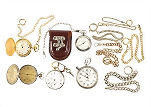 lot: fob watches/clock chains and 1 timekeeper, 1 key pocket watch, signed W. ROTHE POLN LISSA, Roman numerals, fine blued hand, small second at 6 o' clock, diameter = 48.0 mm, 1 HANHARD timekeeper, various fob watches chainsand other clocks, clocks are unchecked !