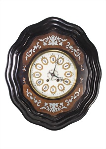 wall clock original Oeil-de-Boeuf OCHSENAUGE, Belgium/France ? 1870/'80s, curved, partially black pickled oval wooden frame, glazed front with wood and nacre inlaid work, white enamel clockface with enameled number medallions (Roman numbers) in A gilded relief frame, strike on coil gong, pendulum is enclosed, c. 50.5 x 59.0 x 13.5 cm, unchecked !.