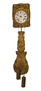 Comtoise, Frankreich Mitte 19.Jhd., signiert: BOISSEAU á Chantonnay, weißes Emailleziffernblatt in gutem Zustand, römische Ziffern, goldfarbenes, floral reliefiertes Blatt, 1/2 Schlag auf Gong, großes Prunk-Pendel, floral, reich ornamentiert, Gehäuse ca. 31 x 40 cm, ungeprüft !